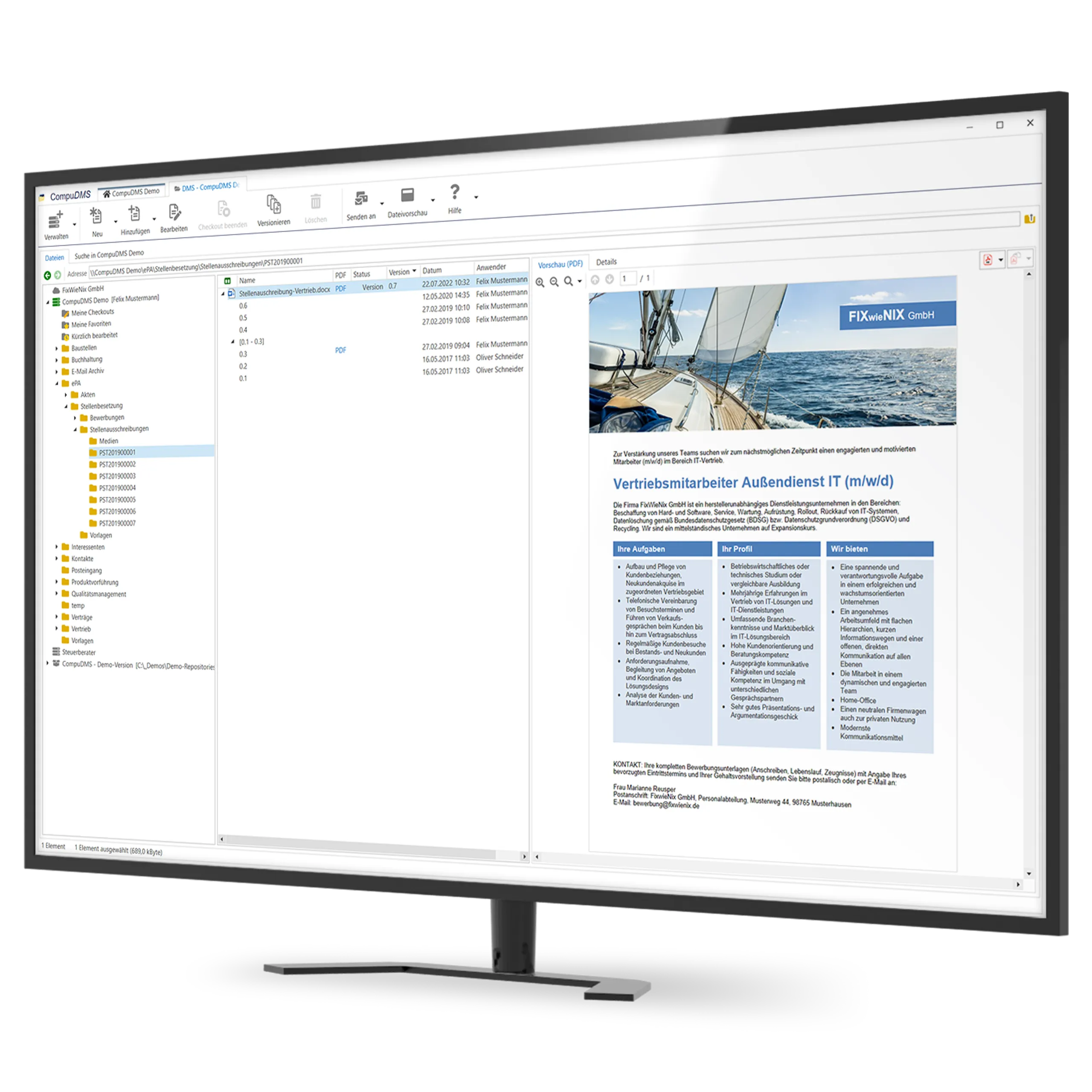 Seit über 10 Jahren bietet CompuDMS eine intuitive Oberfläche, umfangreiche Funktionen und nahtlose Integration in Ihre IT, um Dateien zu organisieren und archivieren. Verwalten Sie Ihre Dokumente mit CompuDMS revisionssicher, GoBD- und DSGVO-konform.