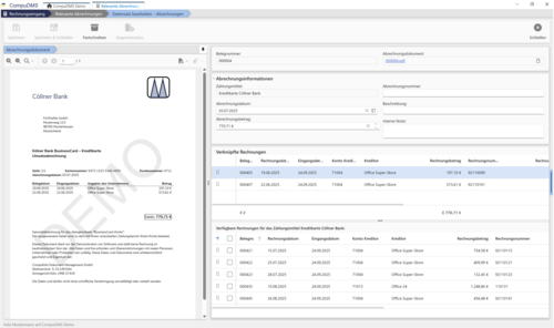 💡 Tipp: Für diesen Vorgang empfiehlt es sich, mit zwei Tabs in CompuDMS zu arbeiten – einer für die Kreditkartenabrechnung, einer für die zugehörigen Einzelrechnungen.
